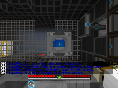 You decided to back to Aperture, and GLaDOS started testing with you again. But you needed to be redirected to the "Old Aperture" chambers, because "[...]you've managed to destroy the water pipes after here.". Then, you're introduced to the "Energy Rod" and to the "Teleportation Device" (in Minecraft terms, "Fishing Rod" and "Ender Pearl"). After a lot of tests, you're redirected, again, to the normal (and abandoned) chambers, after meet GLaDOS in her reconstructed old lair. In some point, GLaDOS have the idea of recycle the "Energy Rod" and the "Teleportation Device". So, she moves you to new chambers she made. After some tests, Wheatley (who previously have send pre-recorded messages for you and GLaDOS) fall on the Earth again, right in Aperture. So, GLaDOS makes him responsible to fix the destroyed chambers. After all this, you back to the Relaxation Vault, waiting for new tests.