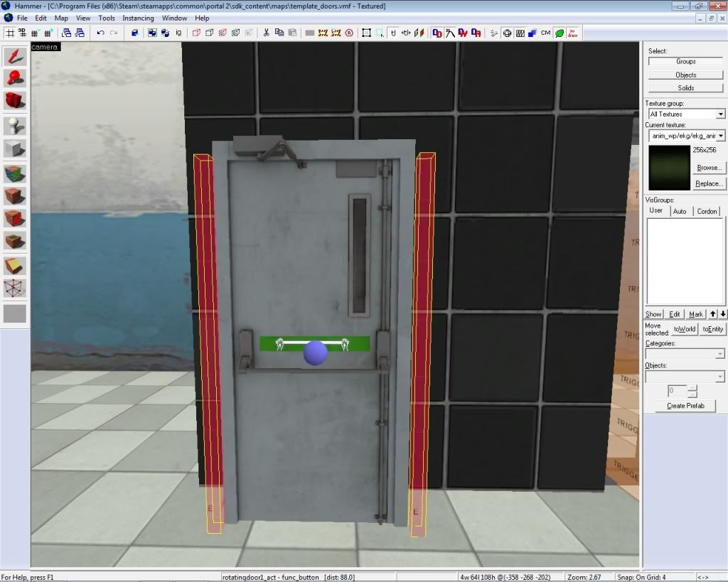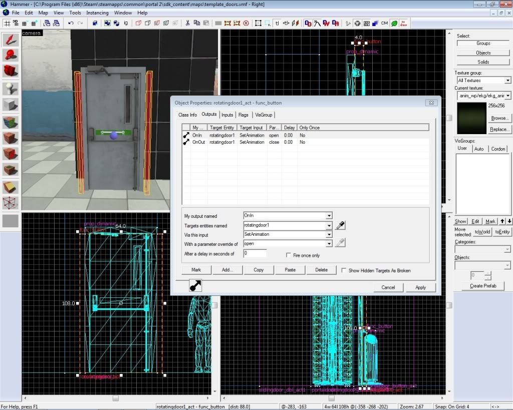 This took me quite some time to figure out how to do properly due to the lack of tutorialsvideos pertaining to this specific subject. To spare the rest of the Portal 2 mapping community the trouble, here is how to make a rotating door using a prop_dynamic entity: